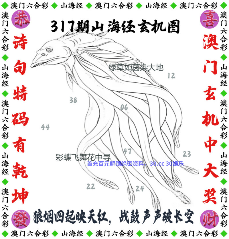 317期:【山海经玄机】开鼠18 解释:绿草如茵染大地,彩蝶飞舞花中寻解羊鼠鸡 解料:狼烟四起映天红,战鼓声声破长空解马兔猪 综合:羊马兔猪鼠鸡 |